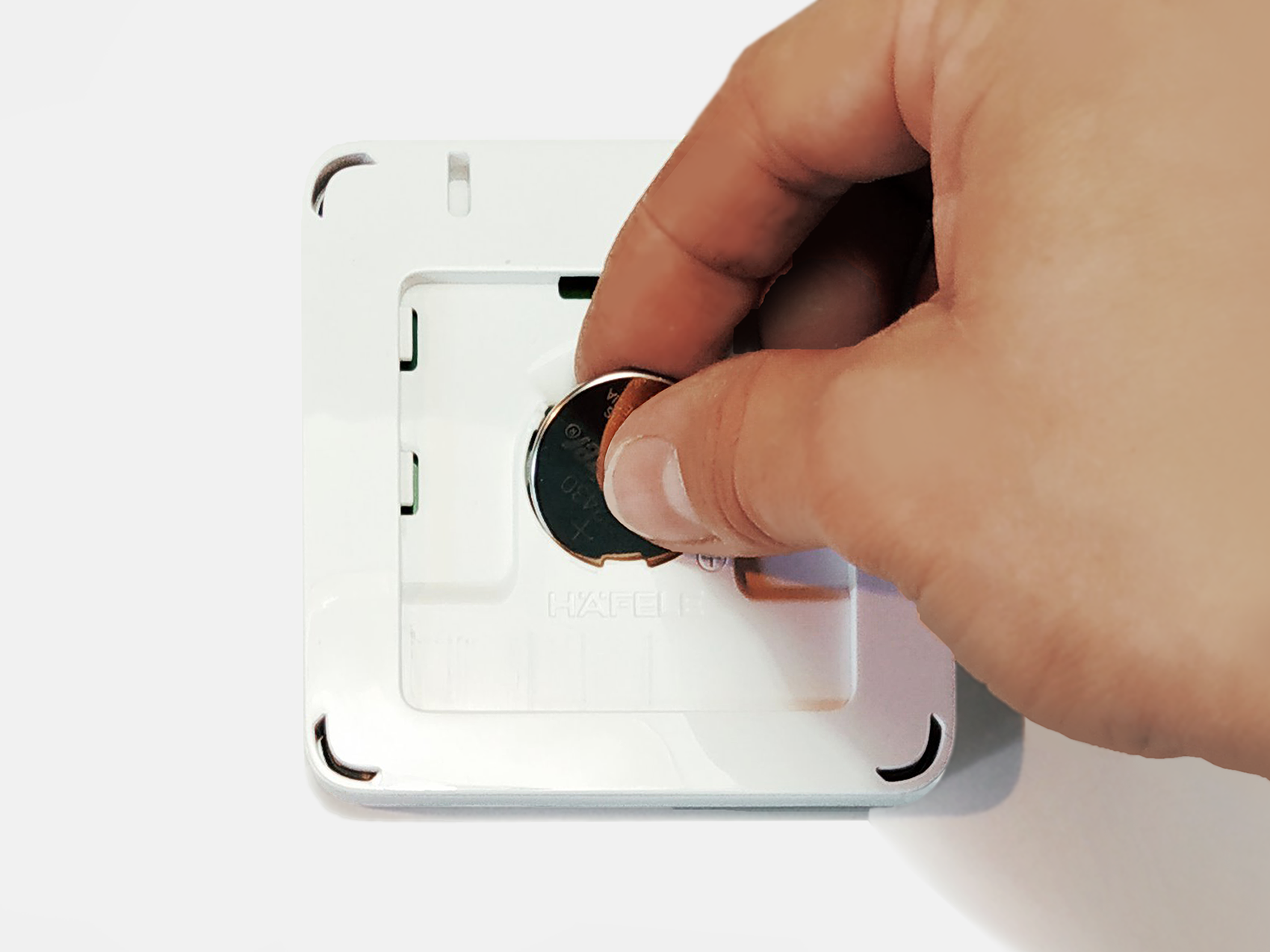 Nehmen Sie zuerst einen Reset des Wandtasters vor. Beachten Sie hierbei, dass eine der Tasten dauerhaft gedrückt werden muss, während Sie die Batterien einlegen und entnehmen.