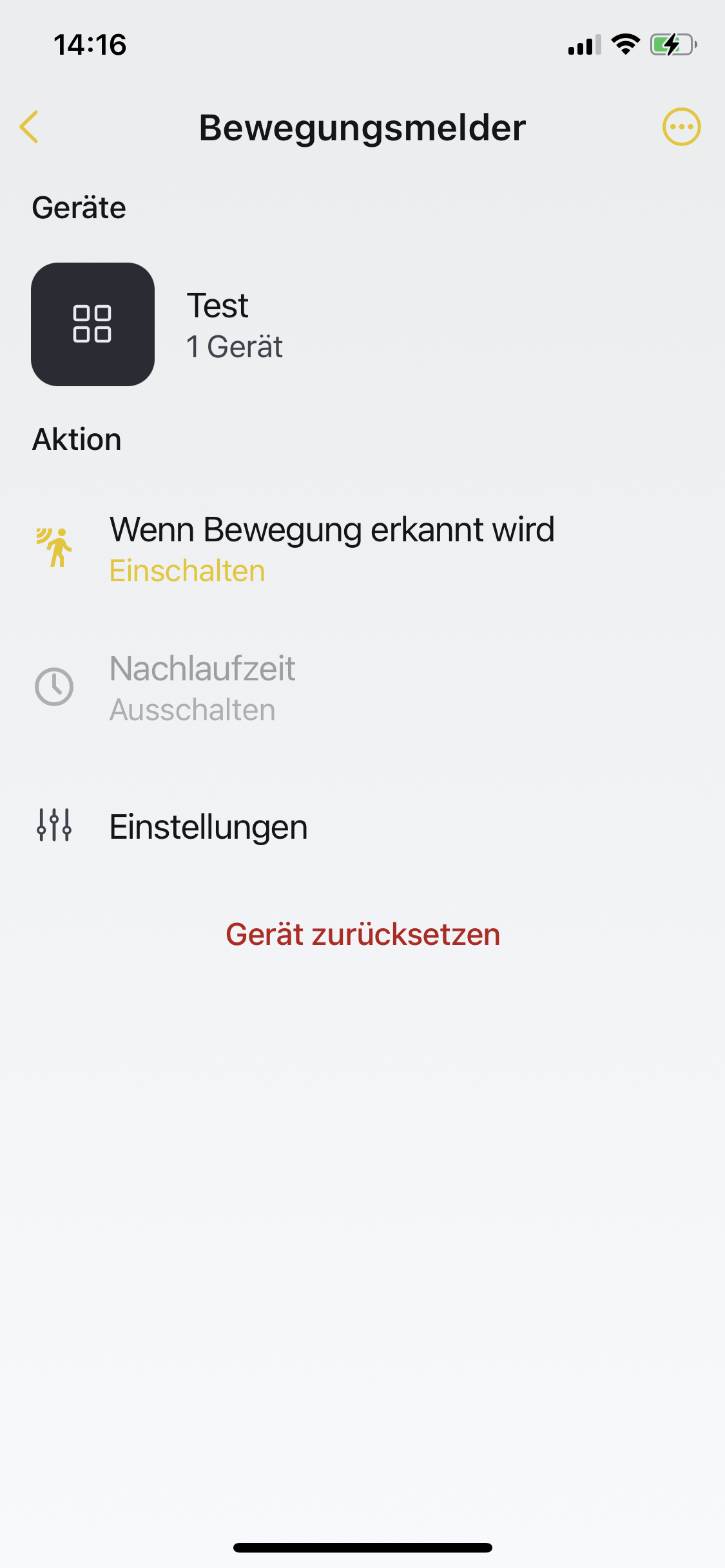 Der Bewegungsmelder wurde nun in die Gruppe eingelernt. Unter Einstellungen können Sie die einzelnen Punkte wie Nachlaufzeit, Dimm-Zeit etc. einstellen. Bevor der Bewegungsmelder richtig schalten kann, lassen Sie ihn ca. 1 Minute „ruhen“ und versuchen Sie dann mit Bewegung die Steuerung zu aktivieren
