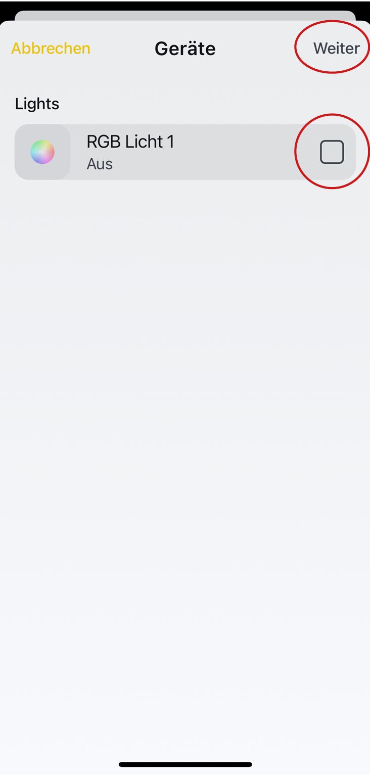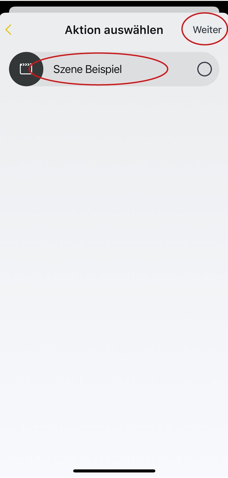 Wählen Sie die Leuchte aus, für die die Szene eingerichtet werden soll. Klicken Sie dann auf "Weiter".