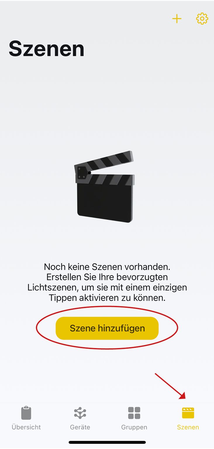 Wählen Sie die Rubrik "Szene" in der App aus und klicken Sie auf den Button "Szene hinzufügen".