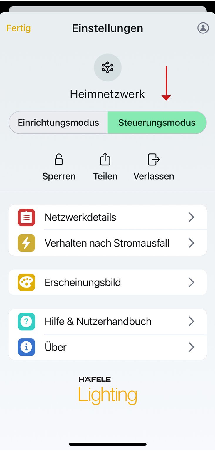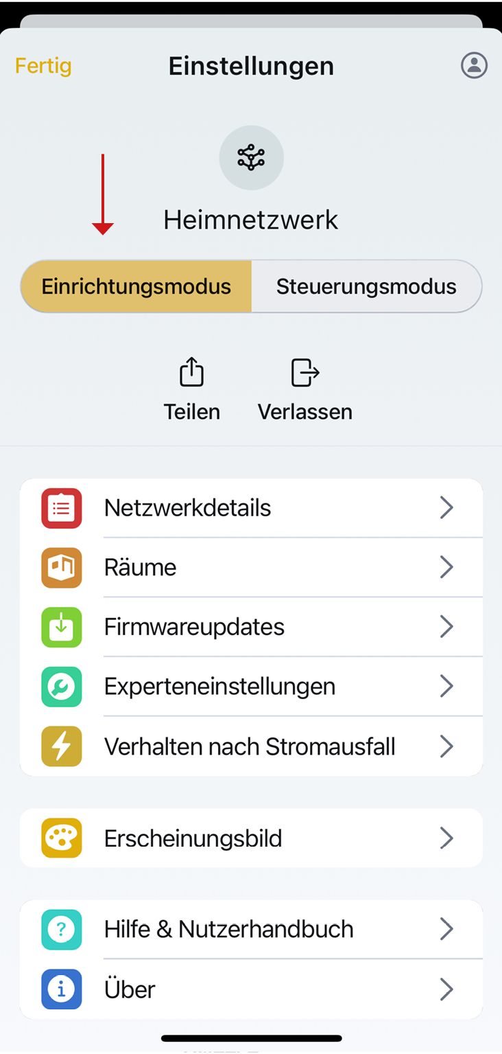 Beachten Sie, dass es zwei verschiedene Modis gibt. Der Einrichtungsmodus dient dazu um die Geräte in der App einzulernen und zu konfigurieren.